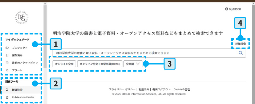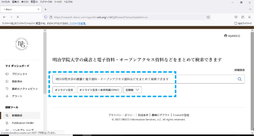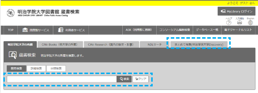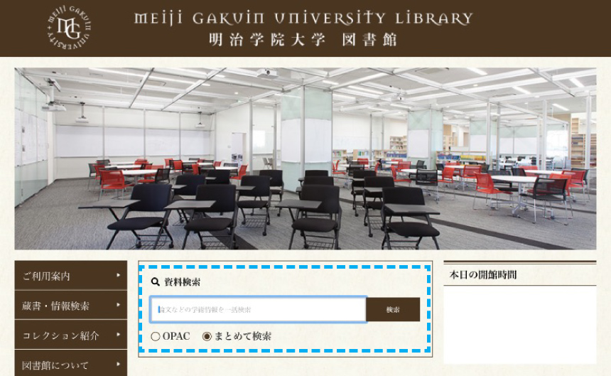 図書館の蔵書と電子資料・オープンアクセス資料などを一度に探せる検索システムです