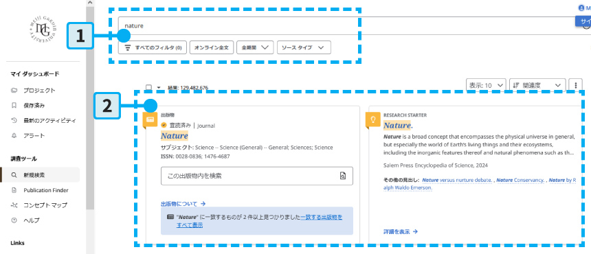 - 特定の雑誌内の論文を再検索できるボックスや、辞典(Research Starter)が表示されます。
