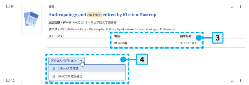 - 3 OPACの【所蔵情報】から抜粋された情報(配架場所・請求記号)が表示されます。